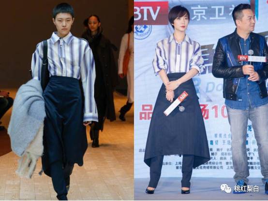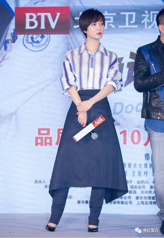 关晓彤前几天参加新剧发布会,也选了这种裤装造型亮相,加上同色系的小高跟,还是挺能突显她的长腿优势的,但就颜色来看,浓重的黑色稍显成熟了点。