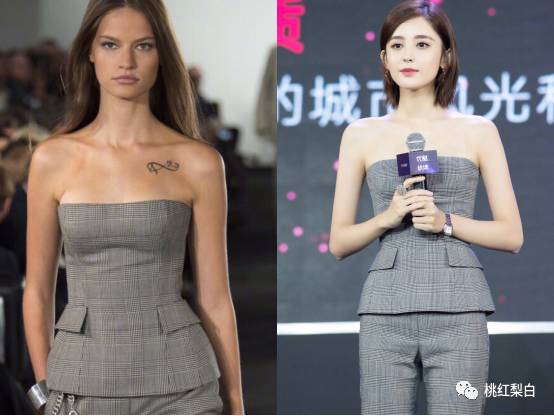 灰色格子系列依然是这一季最流行的存在,虽然是整身大面积灰色格子,但上半身露肩的款式,很好的平衡了整身的露肤度,不会显得太商务无趣,还把娜扎172的身高妥妥的显现了出来,整体还是挺大气时髦的。