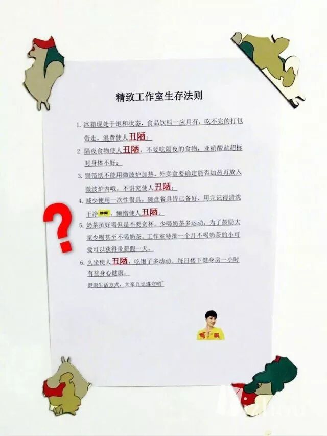 一共六条法则中,每一条都有两个醒目的大字“丑陋”,这是让所有女生无法忍受的两个字。而六条法则真的是事无巨细,可以说是非常贴心了。其中最引人注目的就是“奶茶假”了。
