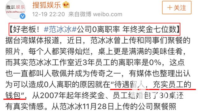 这不前几天还说,范冰冰的公司0离职率,年终奖七位数!!!
