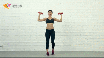 step5:双手一起用力将哑铃举过头顶,再延原路径返回脑后。