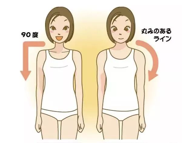 完美的手臂是:肩膀与手臂线条,近似直角线形。如果像右图中肩膀与手臂构成了丸子形的弧度,俗称“溜肩”,为麒麟臂提供了侵占余地,不仅手臂胖,上半身都会膨胀起来。