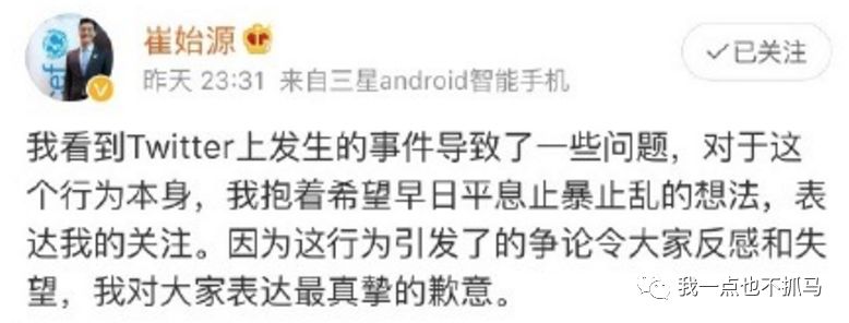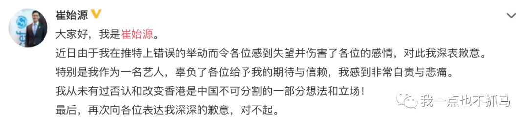 迫于压力,崔始源当天晚上在微博上发了道歉信,表示自己只是希望早日平息止暴止乱。不过短短几句话里,既没有表示支持“一个中国”立场,又语焉不详,实在是看不出多有诚意。