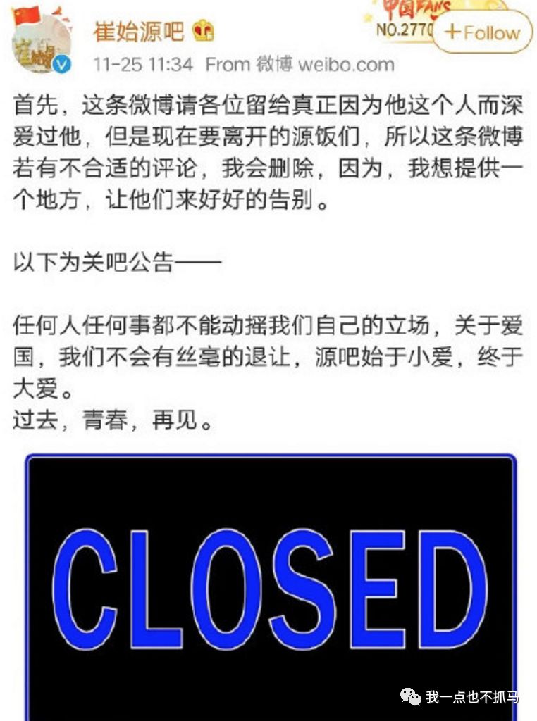 此举一出,不仅看客,粉丝也一片哗然。就像崔始源吧解散前发布的最后一条微博说的那样,始于小爱,终于大爱,贴吧站子全部关闭,多年大粉纷纷脱粉,国家面前无爱豆。