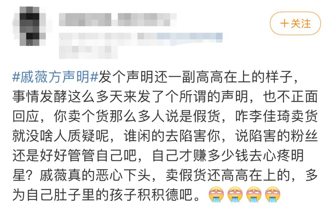 第二次的回应中,戚薇方面的态度显然有所保留了,说的是“若为假货,愿意三倍赔付”,但仍旧没什么人愿意买账,相关话题下头吐槽戚薇吃相难看的网友还是一抓一大把~