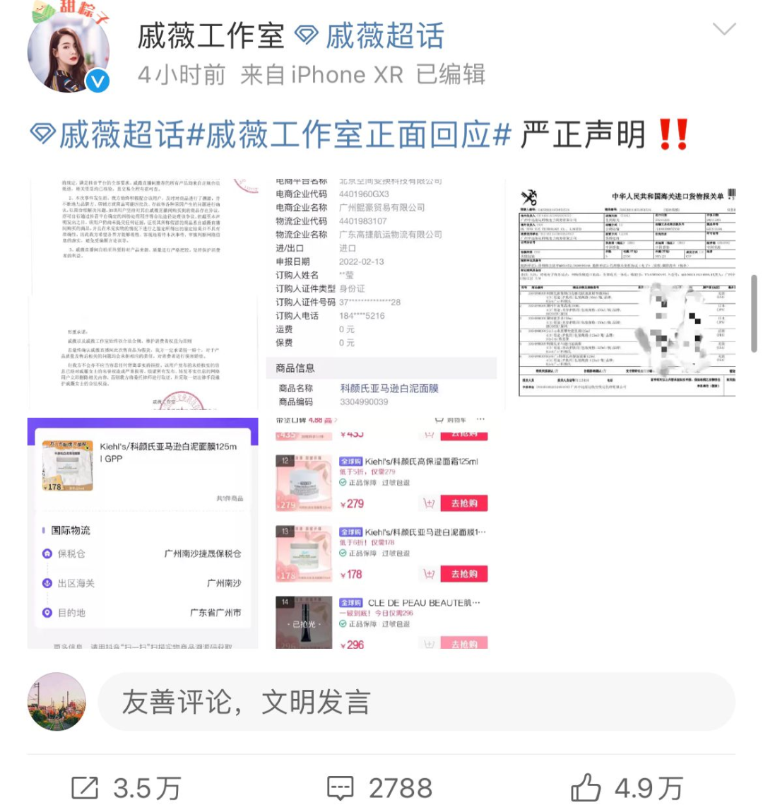 之后舆论越演越烈,戚薇工作室眼瞅着事情压不住了,先后两次回应“假货风波”!