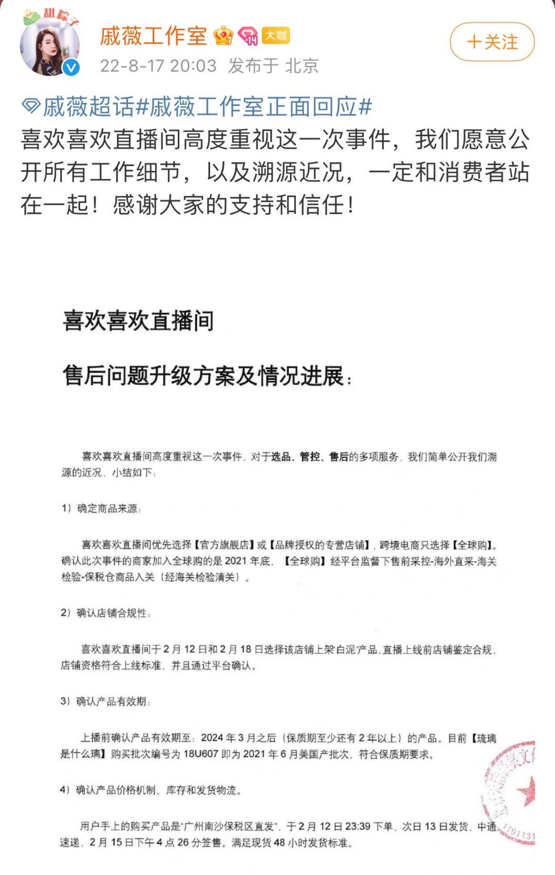 第一次的回应中,工作室严正声明戚薇直播间绝无卖假货的可能性,并po出了和爆料网友处理问题产品的经过,态度颇有点傲慢,结果招来了更多的骂声;