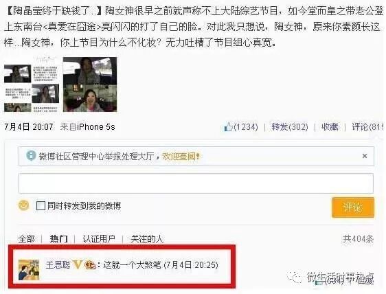 作为苍生老公的王思聪也被她惹怒了,他在微博上批评陶晶莹的新闻,宣称陶晶莹就一个大煞笔。