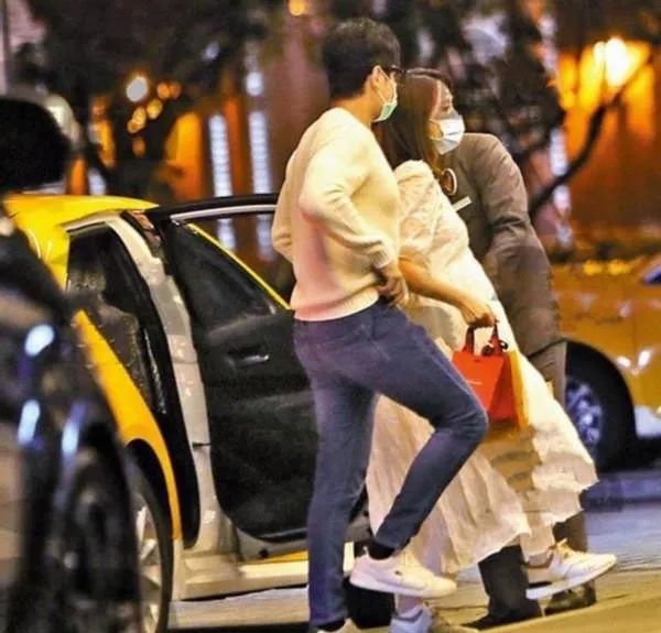 还有这样的照片,陈乔恩宽大的裙子遮住了腹部,男友艾伦也在一旁搀扶着她。