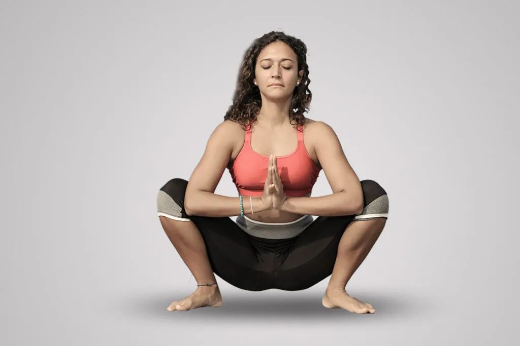 做法:站直,双脚比臀部宽。双脚稍微向外,坐下蹲下。 保持头部和脊柱挺直,不要向前弯曲。继续降低,直到你完全深蹲。完成坐下后,可以将双手放在膝盖上,或加入合十礼。向前看,平稳呼吸并保持姿势4-5分钟。