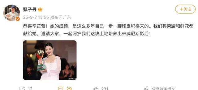 这一次的掌声里 有巩俐与叶德娴留下的回音 也有新一代观众的审美投票 时代在变 奖项在转 观众的口味在升级 唯一不变的是 认真创作的人迟早会被看见 39岁辛芷蕾在威尼斯的灯光下完成了一个闭环 也为下一个循环按下启动键 如果说她曾经“吹过牛” 那么今天这个牛被现实认真兑现 剩下的 就交给下一部作品来续写悬念吧