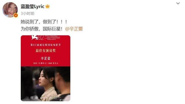 今年9月6日晚的威尼斯亮相 是她职业生涯的关键时刻 9月7日午间她在社交平台晒出奖杯 配上一句“感恩所有” 短短八个字反而像一枚定心针 两小时内热搜直冲第一 评论区从“姐好飒”到“冲破次元壁”一路狂飙 与其说是流量涌动 不如说是多年口碑的集中兑付