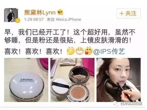 娱乐圈里对护肤最讲究的恐怕要数模特了,身兼模特与演员的熊黛林对护肤化妆再讲究不过,看她时常在微博上晒出工作生活中的状态,这次分享的是雪花秀气垫BB,好多妹子都想拔草吧。