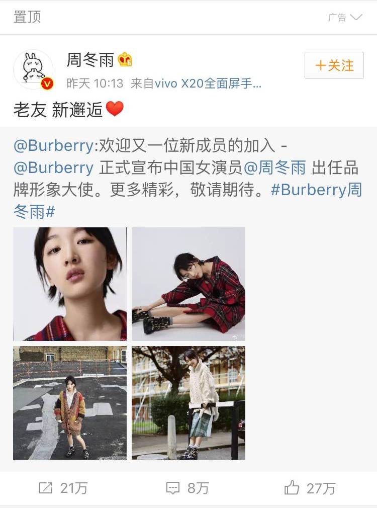 时尚品味突飞猛进的周冬雨也爆出了新资源:Burberry品牌大使。