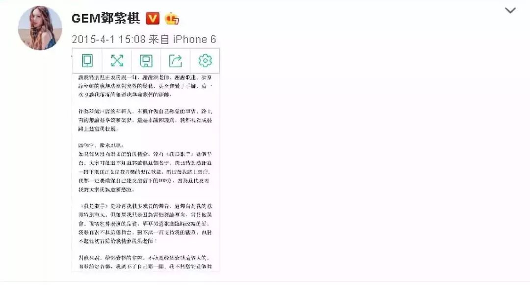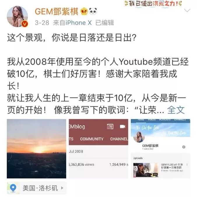 邓紫棋发微博宣布自己个人视频账号播放量破十亿,同时宣布:“我将不再使用GEM blog这个账号、从今以后将使用新账号”,并提醒粉丝“如果大家以后还看到这个账号的更新,请知道那已经不是我本人了,哈哈。”