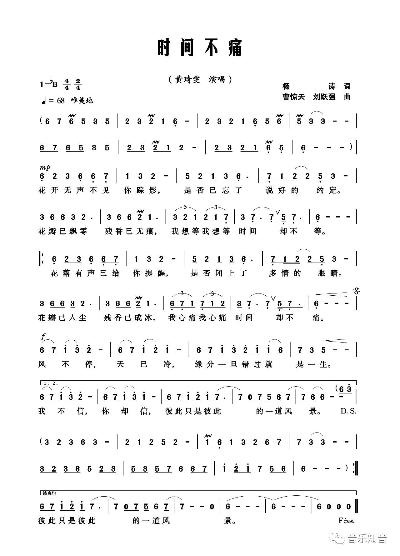 著名歌手黄琦雯有着一副独特音质的嗓音,声线随性、自然,又透出成熟的性感,飘渺空灵的歌声仿佛穿梭于异境与时空旅程中,她不仅有着青春艳丽和时尚的外表,还蕴涵着成熟的内涵以及平淡是真的性情。在这首《时间不痛》的歌曲中,感恩黄琦雯老师用她高超的技术、走心的声线演绎了一个唯美的爱情故事。花开花又落,缘来情又灭。聚聚散散、分分合合,在这个漫漫红尘中,我们又何曾陌生?《时间不痛》是由词作家杨涛作词,新生代音乐人曹惊天、刘跃强作曲、著名作曲家刘跃强监制编曲的一首古风流行歌曲。伴着笛箫渐起的旋律,满目花开叶落的清美,你是否也会走进这个爱情的故事里。