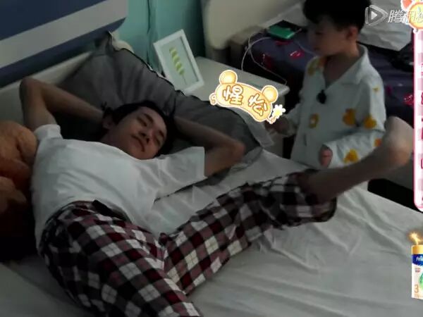 其中易烊千玺离门最近,成为最先被掀被子的对象,只见他穿着白T恤、咖啡色格子长裤,歪歪的躺着,双手高举在头上方,被叫醒时一脸睡眼惺忪,仿佛搞不清楚现在是什么情况,一双腿呈大字体打开,睡姿相当随兴、豪迈。