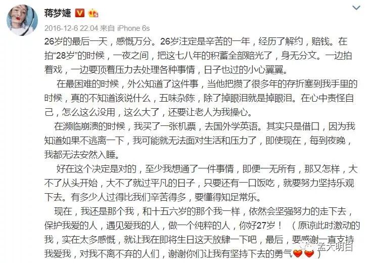 为了做这个决定,她纠结了很长时间,也和家里人都商量过,才最终下决心。为了自由,她付出了八位数违约金,把自己所有的积蓄全赔进去了。最穷的时候,她和助理两个人一个月只花了两千多块钱。爷爷不忍心看她辛苦,拿出一张十万的存折给她,那是老人自己留着养老的钱,她实在没好意思收。
