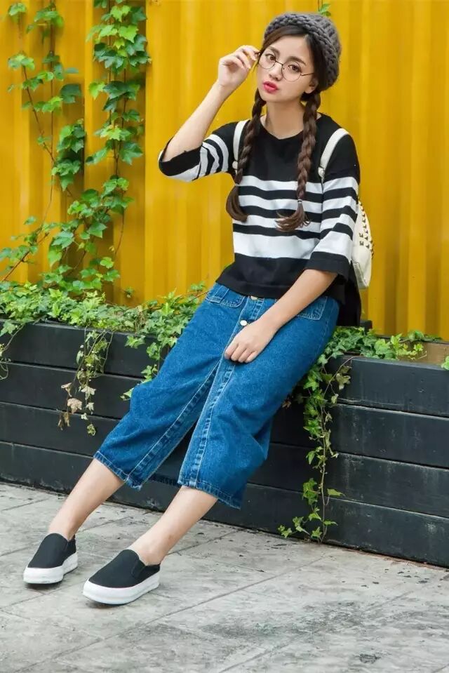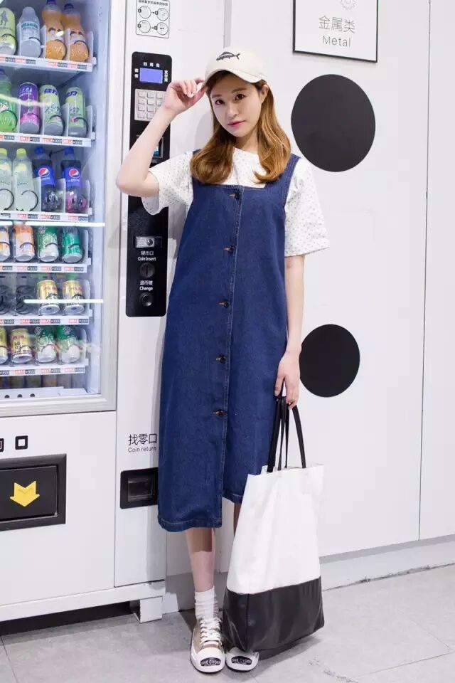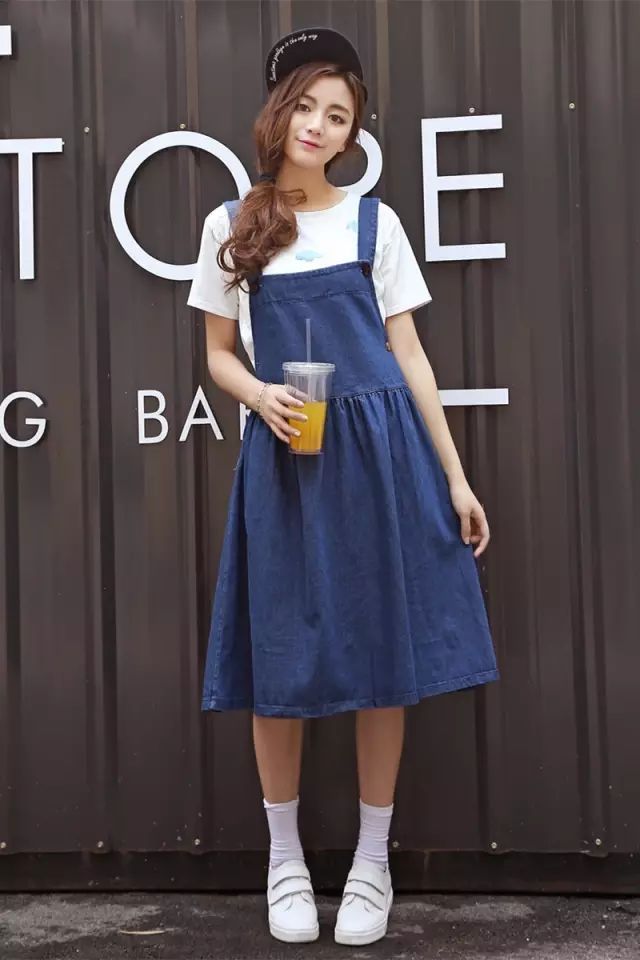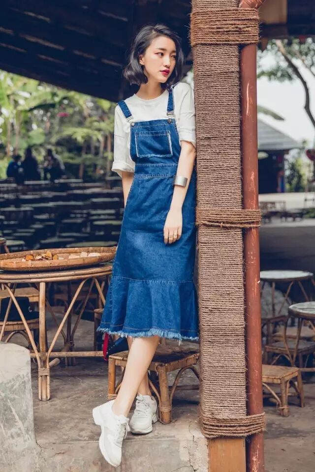 背带款的牛仔裙穿法非常简单,加上内搭即可,建议白色、条纹的款式,会比较有学院风的清新感