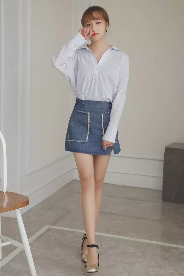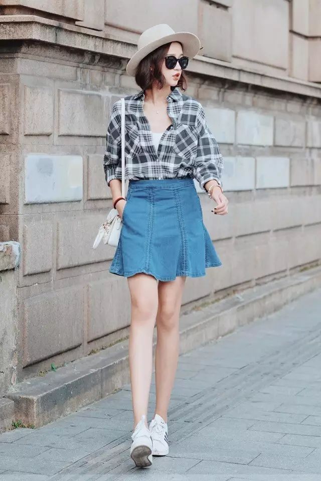 短款休闲款的牛仔裙以A字裙为主,属于百搭能藏肉的版型,但是不太适合瘦小的姑娘,会显得更瘦,不圆润哦~