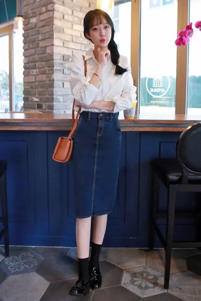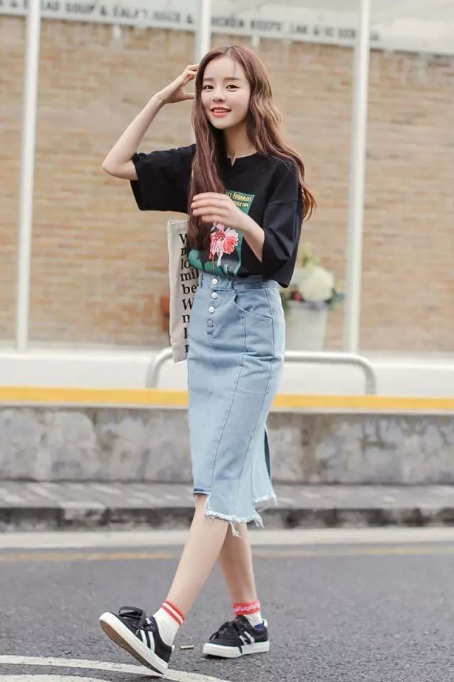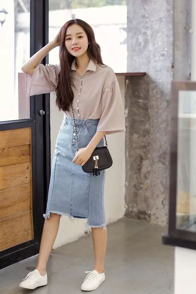 这个长度的裙子是比较难搭的 ,特别是牛仔质感,本身比较休闲的布料上衣如果搭配的太淑女,就会看起来很奇怪,所以还是以休闲、率性为主哈