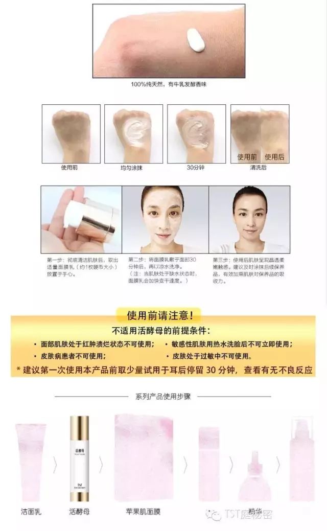 TST活酵母的工作原理简单来说就是脸部体温激活TST里的酵母,它会发酵,会深入皮肤肌底层,会吃掉你皮肤上的死皮,角质,粉刺,黑色素等脏东西,然后排出皮肤所需的胶原蛋白和氧气等,从而使皮肤由内而外达到最健康的状态。