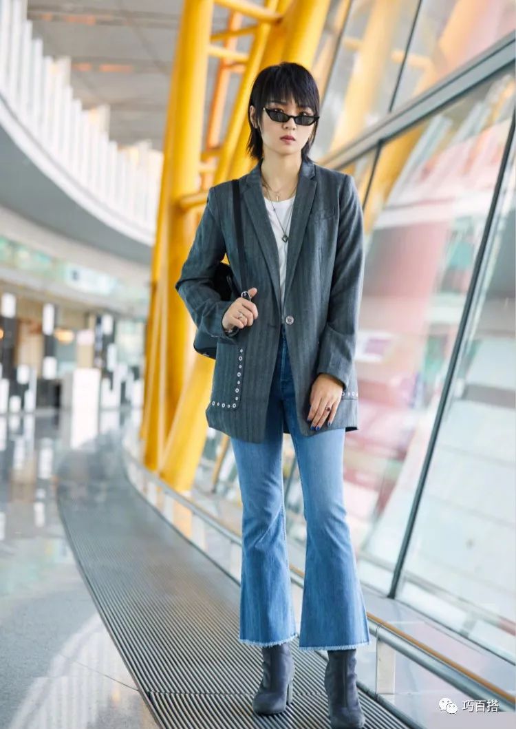 印象中的周笔畅是一个戴着黑框眼镜的短发女孩。而现在的她则蜕变成一位妥妥的时髦精。现身机场时,周笔畅身穿MICHAEL Michael Kors灰色西装外套内搭白色T恤,简约又时尚。下身搭配浅蓝色复古喇叭牛仔裤,将纤细笔直的大长腿展现的淋漓尽致。脚踩黑色高跟靴,使得整体造型时髦感爆棚!