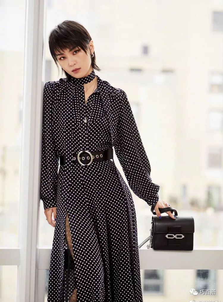 众所周知,波点连衣裙可清新也可性感,是女明星们钟爱的的潮流单品,不过也有人会觉得波点裙不好搭配,很容易显得老气。像周笔畅这样身穿一袭黑色波点裙,优雅又时尚,裙身高开叉的设计使得性感的大长腿若隐若现,尤其是打底花纹丝袜的显现更是增添一丝情趣,哩另外黑色腰带的加入很好地提升腰线,给人一种腰以下全是腿的既视感呢!