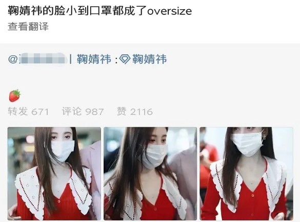 鞠婧祎口罩的款式也被扒出来了,拉开要比普通口罩大一圈,谁带都会显得脸小的。