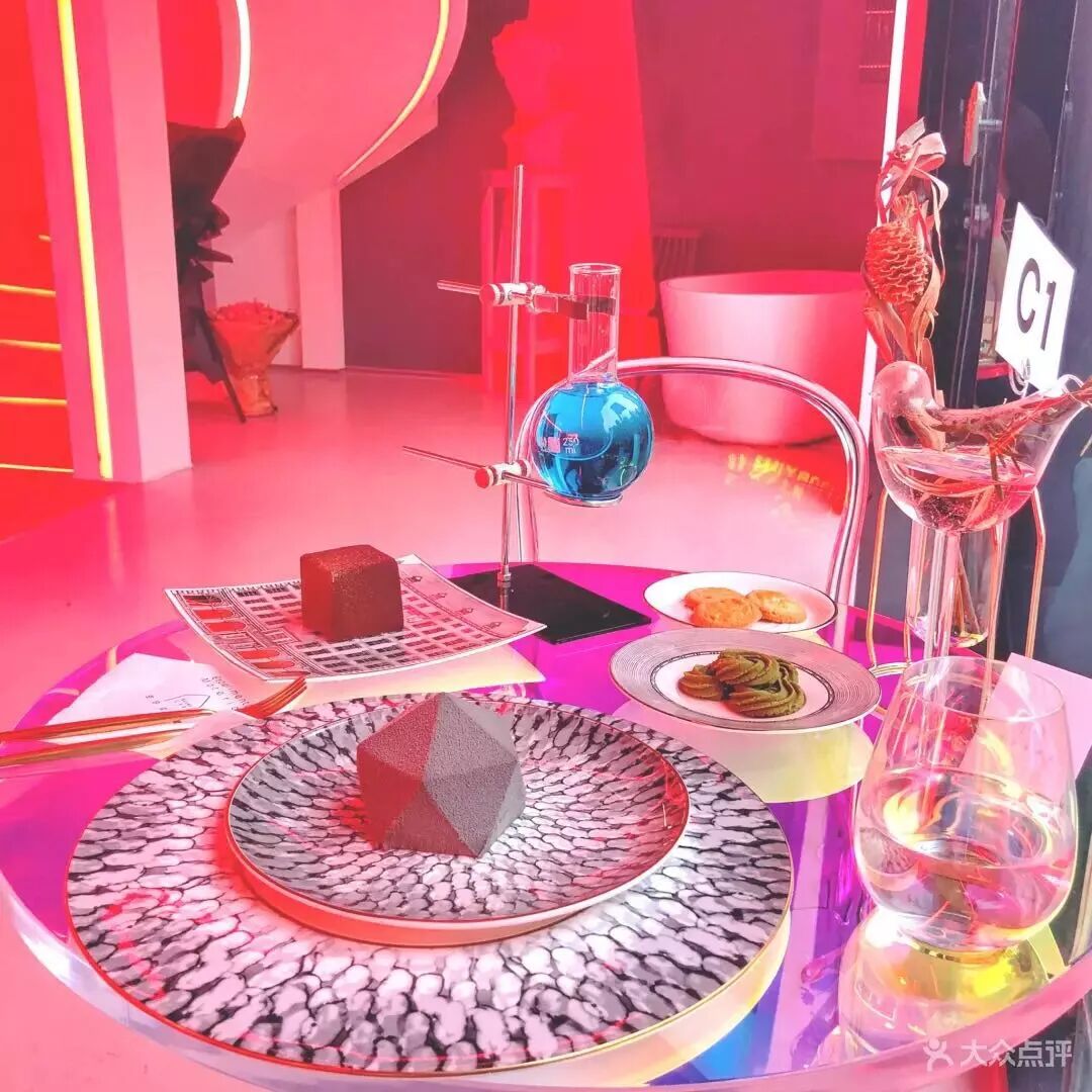 甜品都装在培养皿中,餐刀像手术刀,饮料瓶标明了涩度、鲜度、甜度、浓度,菜单还用中英文注明了产品成分,号码牌不同的数字对应不同的元素符号。