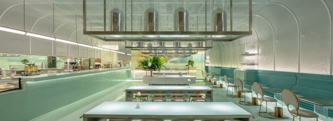 走进餐厅内,不是当下最流行的网红“ins”风,也不是性冷淡的“黑白灰”,更不是辣眼睛的“骚粉色”,主色调大胆地采用了市面上少见的冷色调,Tiffany蓝(饱和度更低一些),透露出一股冰冷严肃的“研究员”气质,也正好给炎热的夏季降降温。