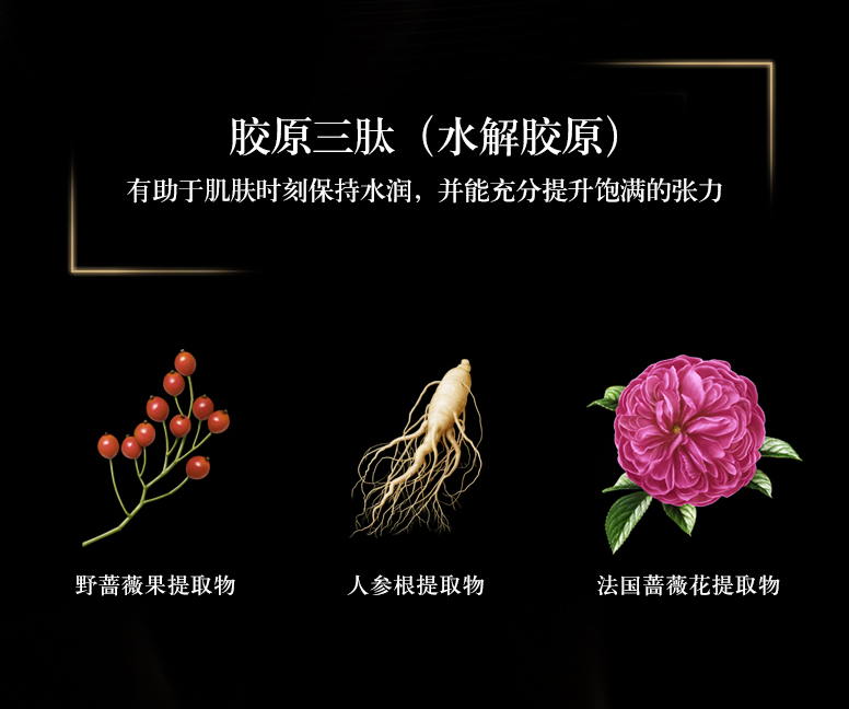全系列采用了蔷薇果提取物、人参根提取物、胶原三肽(水解胶原)、法国蔷薇花等多种有效提升张力和弹力的卓效滋养成分,让处于干燥松弛困境中的肌肤获宠重生,掌控紧实向上之美。