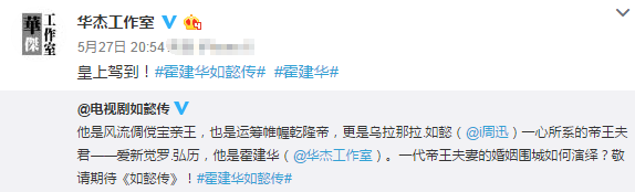 而在《如懿传》官方微博公布了这一消息后,霍建华的经纪方华杰工作室也替没有微博的“老干部”证实了这一消息,该微博转发了《如懿传》官博的微博,并俏皮的称:“皇上驾到!”困扰了网友许久的《如懿传》人选问题,终于水落石出。