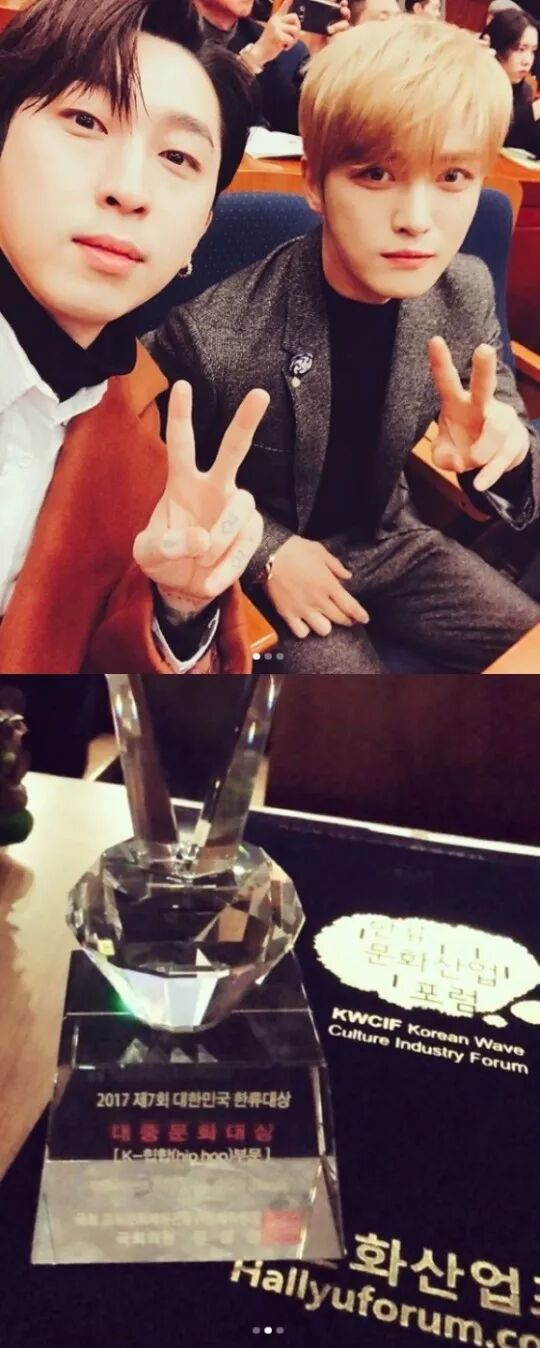 歌手SLEEPY在2017 第7届大韩民国韩流大赏颁奖典礼中的K-HIPHOP部门获得了大众文化大赏之后跟金在中留下了认证照。