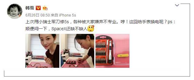 最近,韩雪直播分享自己的科技收藏,还直播用瑞士军刀换手机屏幕,秀了一波操作。而遭遇任何损害消费者权益的问题,韩雪也都是用力怼回去,因为她觉得这是她应该做的。