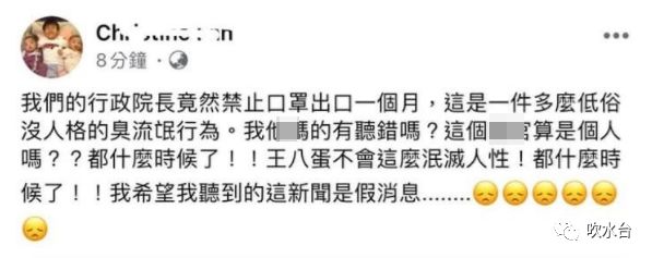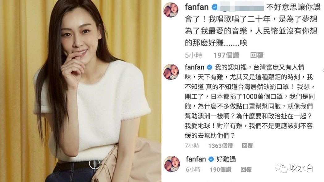 范玮琪爆粗骂台“禁出口口罩”没人性,遭杜x泽黄x生围攻! 吹水台 港台女星 2020-02-14 22:59:02 708 创作不易,用心坚持,欢迎请BaGua喝几杯爱心咖啡!打赏并支持本文 打赏并删除本文 最近港台娱乐圈非常热闹恐怕小S范玮琪自己都没想到就因为网上最近一次发声自己竟然会遭到抵制范玮琪因为当地禁止物资外销而大骂长官“狗X”因此遭到部分艺人和网民的炮轰为此还迫道歉杜x泽当时没有放过机会抽水直接开名炮轰范玮琪又跟黄x生互动起来话范玮琪“头发长见识短”一场肺炎却可以看出人心哪些人雪中送炭哪些人落井下石我们都记住了 创作不易,用心坚持,欢迎请BaGua喝几杯爱心咖啡!打赏并支持本文 打赏并删除本文 感谢您的支持鼓励,我会继续努力的!文章地址:用户邮箱:打赏金额:USDT 请输入数字点击”去打赏“,即可进行打赏支持本文章哦 范玮琪 About the Author 吹水台 功能介绍:添加小编,进群看更多! Related Posts 李克勤突传举家移民英国?本人公开回应… 2021-04-06 00:57:54 徐子珊退出娱乐圈2年,如今突然在内地爆红… 2021-03-15 02:12:23 陈自瑶公开发表... 2021-02-01 02:29:14 张敬轩又有新视频,超大尺度… 2021-01-10 02:11:41 剧情大反转!周柏豪被打脸?! 2020-12-24 08:38:24 发表评论