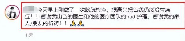 许怀欣在社交网上说道:今天早上刚做了一次膀胱检查,很高兴报告我仍然没有癌症,感谢我出色的医生和他的医疗团队的rad护理,感谢我的家人,朋友的祈祷!
