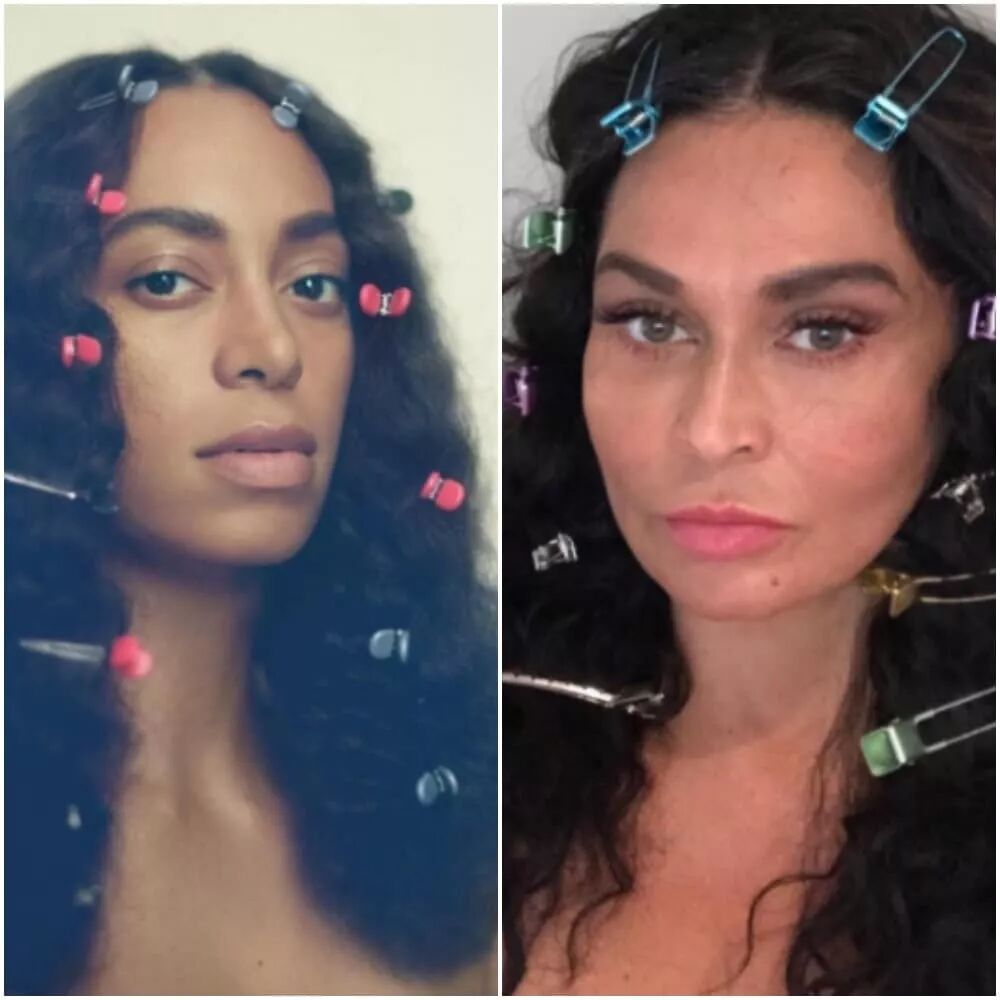 夹了一头发夹,摆出严肃脸,模仿小女儿Solange的专辑封面。