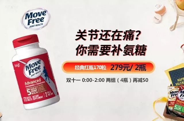 【第一重】Move Free氨糖软骨素红瓶170粒*2瓶,原价349元,“双十一”活动价:299元,复制下面的淘口令进入后直接领20元券,最后价为279元;Move Free氨糖软骨素绿瓶120粒*2瓶,原价329元,“双十一”活动价:295元,淘口令进入后直接领20元券,最后价为275元。
