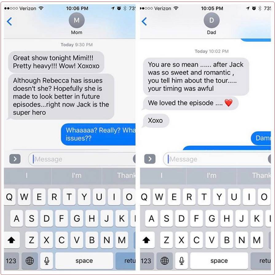 美剧This is Us女星Mandy Moore在电视剧播出后,收到爸妈的消息。