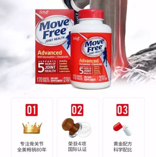 Move Free红瓶适合早期预防,主要成分氨基葡萄糖和软骨素,有效滋养我们的关节软骨。