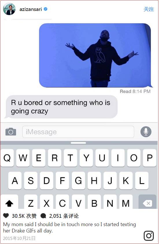 喜剧演员Aziz Ansari在跟妈妈的聊天里,用Drake表情刷屏。妈妈看得一头雾水。