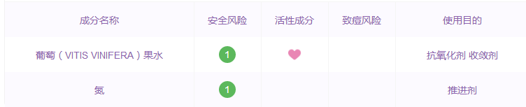成分很简单只有葡萄水,要说喜欢它的原因应该就是喷出来时有淡淡的葡萄味吧。