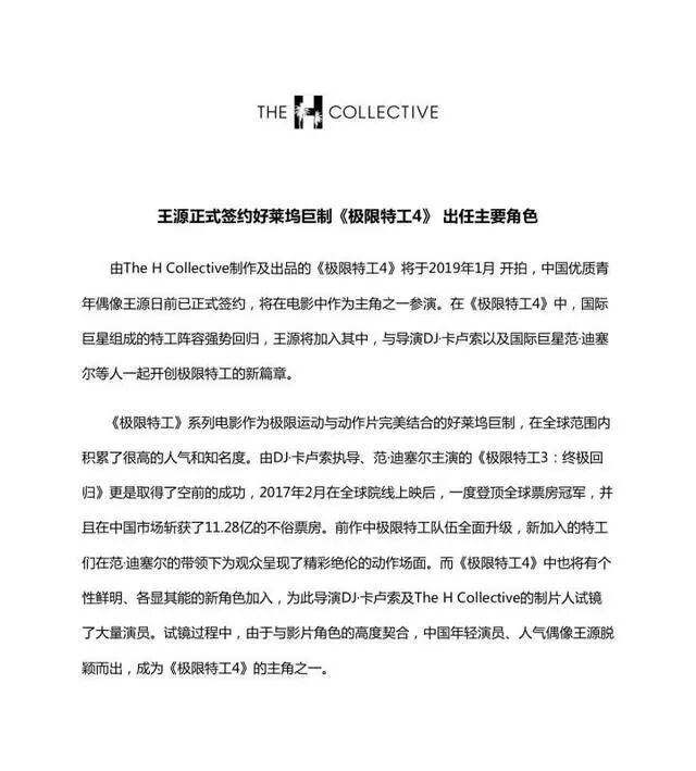 日前,The-H-Collective签署了4个新项目,其中包括《极限特工4》。王源正式加入《极限特工4》,将作为主演之一加入极限特工团队,搭档合作导演DJ·卡卢索及国际巨星范·迪塞尔!相信这对王源进军好莱坞,迈进国际化大舞台能带来很多帮助。