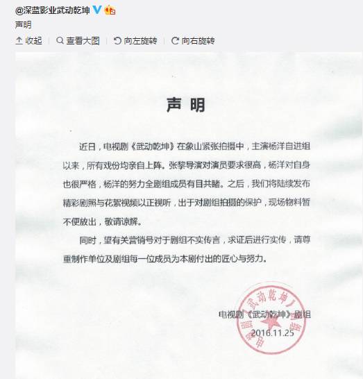 而《武动乾坤》剧组11月25日凌晨1:49就发出了的声明,称“杨洋自进组以来,所有戏份均亲自上阵。”而在和“关八”的对话中,刘小姐是承认有替身的存在的——