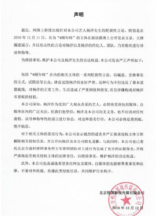 昨天晚上,杨洋的经纪公司发出声明斥责网友“顾年时”发表一系列对杨洋贬损性言论,称已请律师搜集证据,并将追究其法律责任,绝不姑息。