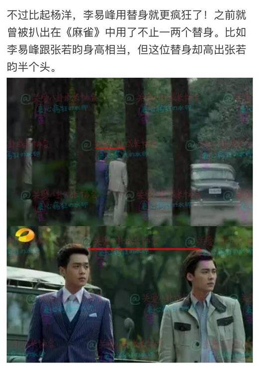 而后,该文提到了杨洋的“死对头”李易峰滥用替身的情形:比杨洋更疯狂——