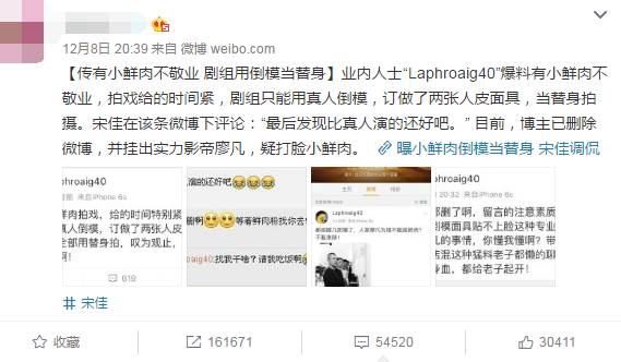 本来以为这件事告一段落,没想到12月8日,一位业内人士不公开点名,称有小鲜肉用“真人倒模”订做了两张人皮面具,除了近景,全部用替身拍——
