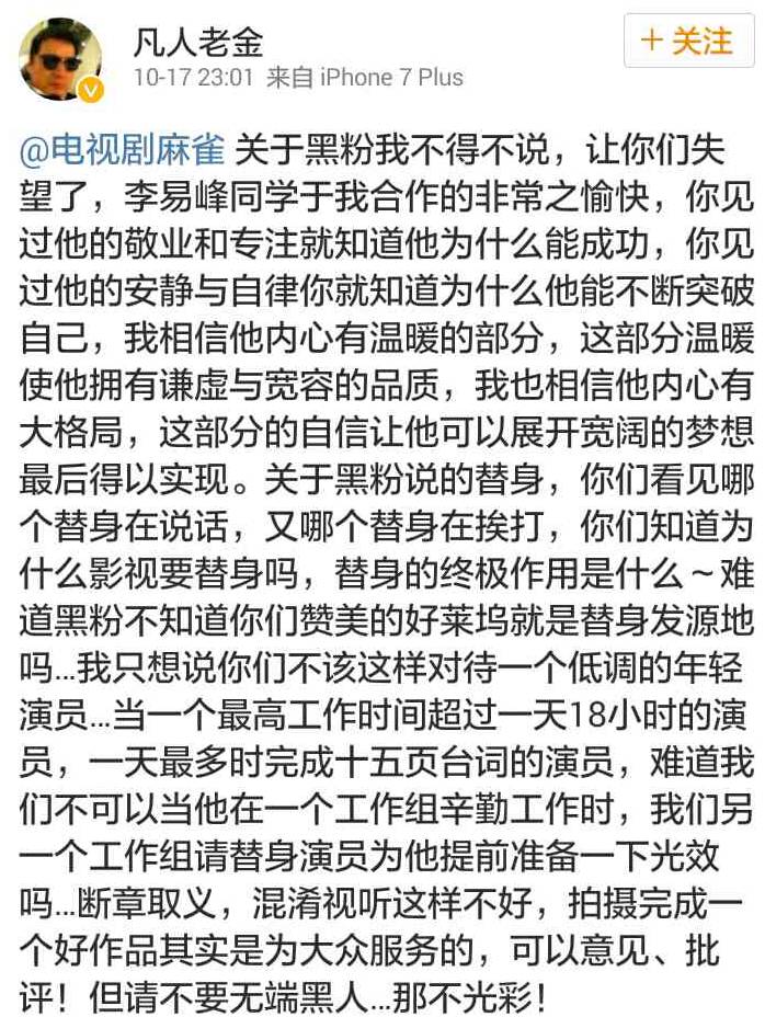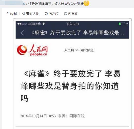 这篇文章发出后,李易峰这边倒显得安静了许多。因为《麻雀》从播出到播后,关于批评李易峰滥用替身的声音就很多——