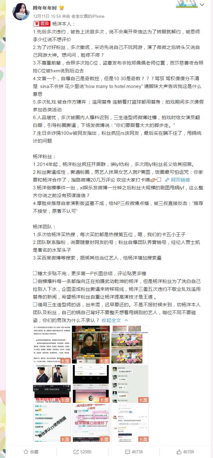 “顾年时”作为李易峰粉丝,自然会让其评价杨洋的帖子不客观。但是作为粉丝,制作“杨洋黑料”的帖子又是可以理解的。同样,杨洋粉丝罗列李易峰的黑点也是没有问题的。